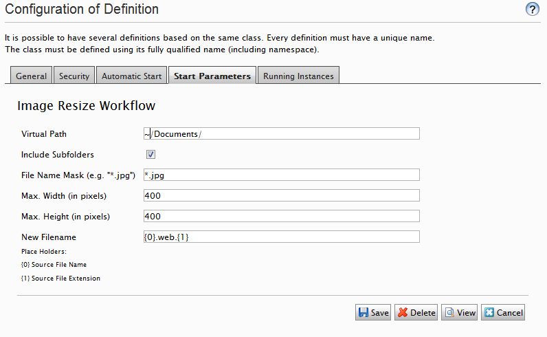 However, we only want to resize certain image files, so under “Start Parameters” we configure the virtual path they are under, a file mask, and the max height/width we want to generate. The workflow will always ensure the correct aspect ration.