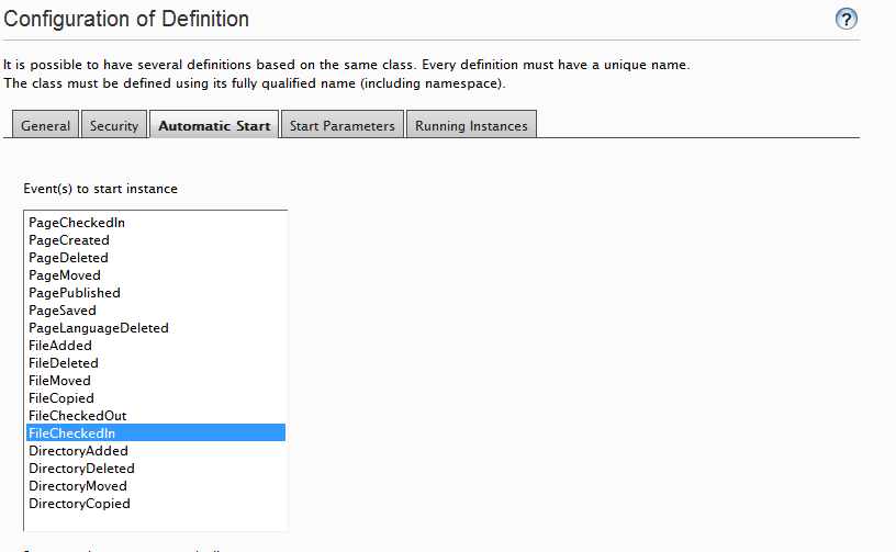 Once the workflow type has been configured (and saved) you are ready to attach it to an automatic start event – in this case it makes the most sense to attach to “FileCheckedIn” which happens whenever a new version of a file is checked in.