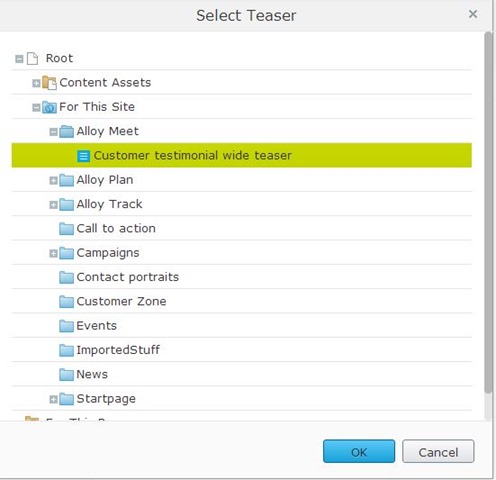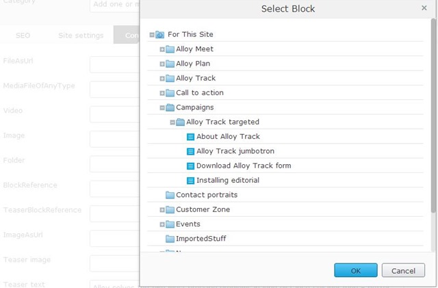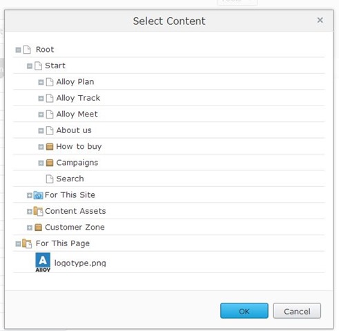 So far, we have looked how to use the built in ui hints to select content. Let’s see how we can create our own selection rules. If you want to narrow down selection, there are two ways of doing this. First, you can use the AllowedTypes attribute to define what can be selected: