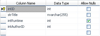 The Movie class has three properties, plus one, ID, inherited from FrameworkEntityBase, that should be saved to the database. We’ll create a table named “tblMovie” with four columns, “intID”, “strTitle”, “intRuntime” and “intAuthorID”. We’ll make “intID” the primary key column.