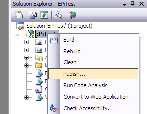 Open your EPiServer project in Visual Studio and right-click the project node. Find the option “Publish”. When you click publish Visual Studio will do a build of the project and export the necessary files to the supplied path (the path should point to your manager installed site).
