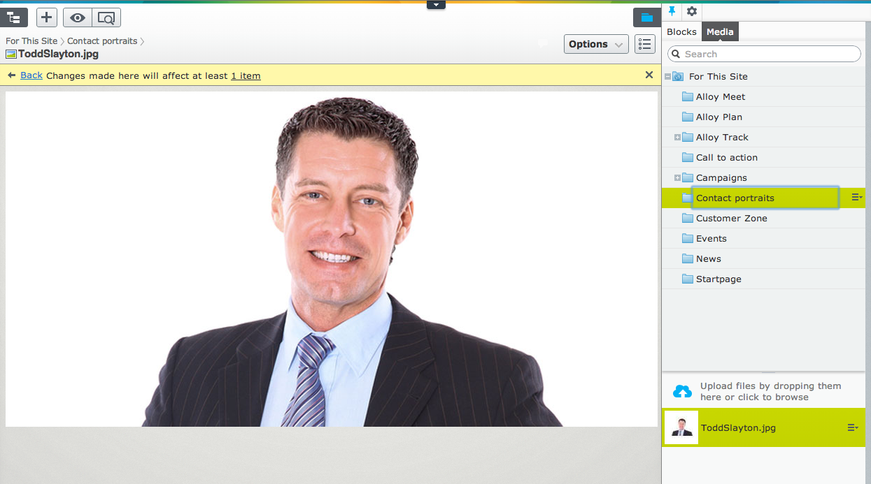 The file manager was one of the things that we didn’t have the time to bring into the system redesign in 7. Now it’s finally here, but what does does this actually mean? First of all, working with media files is now done using the exact same pattern as when working with other types of content such as pages and blocks. Go ahead and schedule media files, create drafts, drag it directly to content areas, personalize it, etc. This will be even more important moving forward when we will be working more with content that belongs to specific campaigns. Developers will be able to create content models and renderers for media files in the same way as for other types of content.