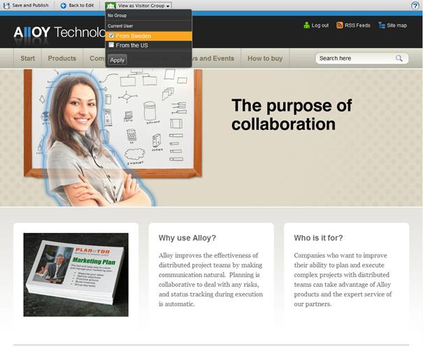 Using the new preview mode, you can see what the page looks like for the different visitor groups that you have targeted. When the page is ready, click Publish. Yes, this is the exact same functionality that exists in the CMS preview mode!