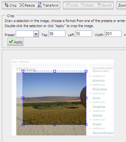 In the sample above I've uploaded an image that is too big for the page. Depending on how the page is designed the image may then "push" the left and right columns to the sides and ruin the layout. In this case the central part of my image should be an air balloon, but it's almost completely hidden behind the right list. In previous versions of EPiServer I could have changed the size of the image, but that's not what I want to accomplish. I want to focus on the balloon.