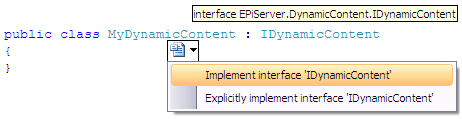 Next step is to make the class implement the IDynamicContent interface. Add the statement to the class declaration (" : IDynamicContent"), click the interface and choose "Implement interface 'IDynamicContent'".
