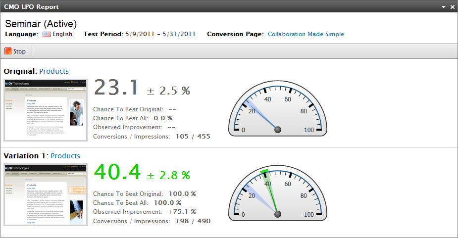 - The CMO LPO Report gadget shows current statistics to estimate which will be the winning page.