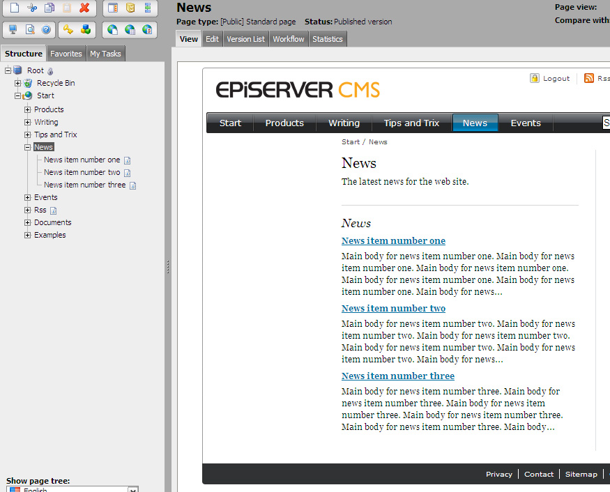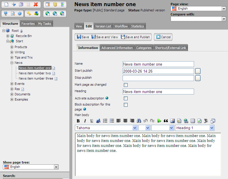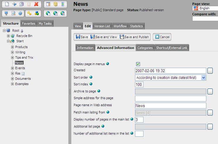 Note that in this very simple example the listing will display the page name for the news item together with the first part of the text entered in the main body, where the text is cut off after a certain length. Also in this example, each news item is set to be hidden in menus, since you often don't want the news item to be displayed in a menu.