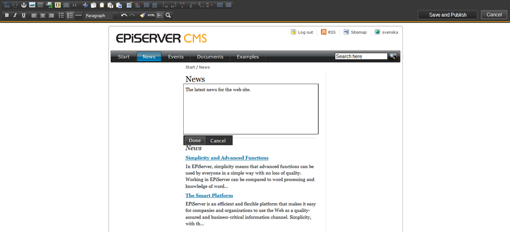 The “Occasional editor” I mentioned before is an interesting persona to consider. This is a person who’s job has another primary purpose other than editing content – but they still contribute content for the web – within their area – on occasion. A classic example is an HR manager that puts a job-listing on the companies web site twice a month. They typically don’t use the system enough to be extremely familiar with edit-mode, yet they need to easily get their content out there, not to increase the workload of the full time editor. In many cases we’ve found that they are a bit intimidated by the full-blown edit-mode and not really sure which properties should hold which content. In previous version we had the “on-page-edit” mode for them, so in this version we have enhanced it quite a bit – and given them the full power of TinyMCE – while still editing their context on the page! This means they can setup styles, tables, links, images and so on.