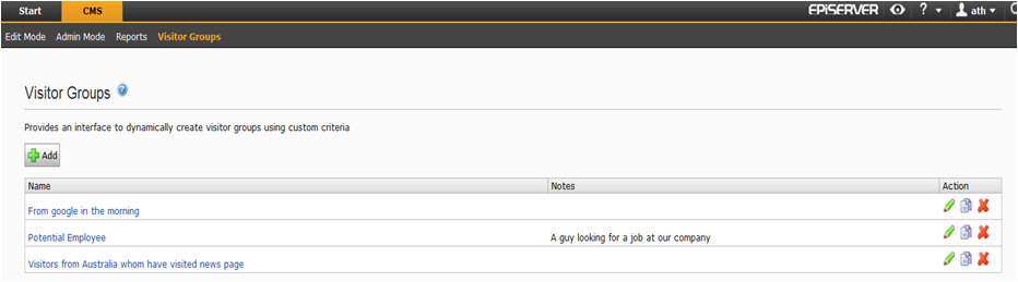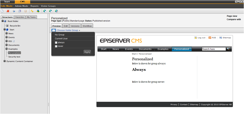 Once you have defined some visitor groups (for instance “Competitors”, “Potential customers”, “People from Sweden”, “Potential employees”) you can use the groups to target content. You can simply select any content on a page, in a text-box, or a piece of dynamic content, and mark which groups should be allowed to see it. Or you can take it one step further and setup permissions for the groups, in the same way as you are already doing it with regular members and roles.