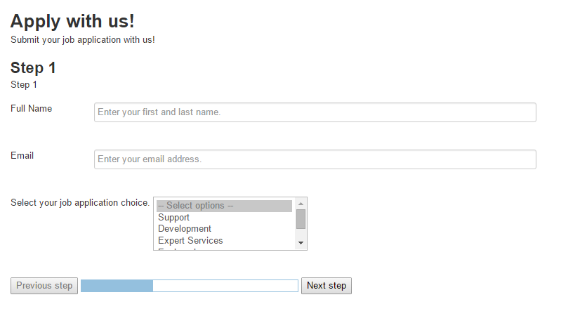 Forms can either consist of one single step – as we are used to with xforms, but you can also start adding 'Form Step' dividers to your form which turns it into a multi-step wizard. This is really helpful when building surveys, quiz's and other bigger forms as visitors tends to get scared away from massive single page forms. When forms are used in multi-step there is pagination buttons as well as a progress bar to always help the visitor understand how much is left.