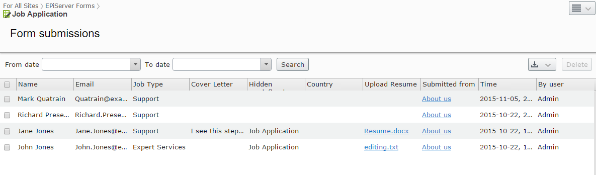 Needless to say we of course also offer a full interface to store and browse the submitted form data in Episervers UI.