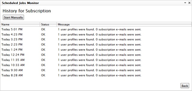 This view is shown when the name of a scheduled job is clicked. The history will automatically update after the job is executed manually using the ‘Start Manually’ button.