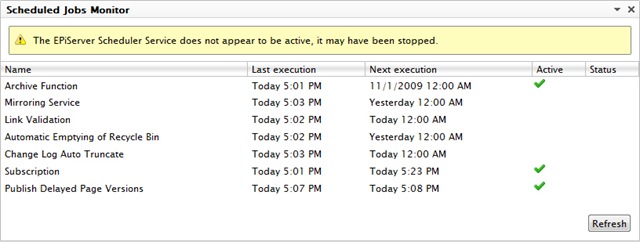 This warning message will be displayed if the EPiServer Scheduler Service does not appear to be active. Please note that this message is displayed during application startups for a few moments sometimes.
