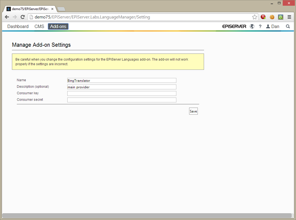 Option (1) is simple enough, you create a blank version of the page in a new language, and enter your content. With the EPiServer languages Add-On you can even duplicate the content of an existing language and edit that, which might make it even easier. This works well if you have an internal team to do the translation, or your comfortable giving a third party access to your site to do the translations. Option (2) is good if you want to outsource the translation and you don’t mind paying for it. You get quality translation by professionals and they use their own internal tools for the translation – they don’t need to have access to your site itself. The process is seamless and efficient. There are a number of Add-Ons from various translation vendors that you could use – I won’t name them for the sake of avoiding any favouritism, but they work well. However, what about option (3)… the automagic option? If you are happy with a quick and dirty automatic translate, maybe you want to go Google Translate style? The EPiServer languages Add-On will do this for you as well… albeit with the Microsoft alternative to Google Translate, called Bing Translate. I believe it’s been chosen for the API and the more favourable restrictions, but it does a very good job with the common language translations.