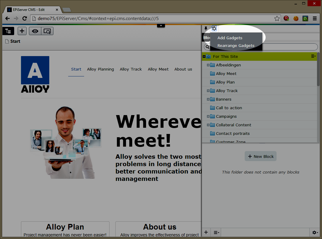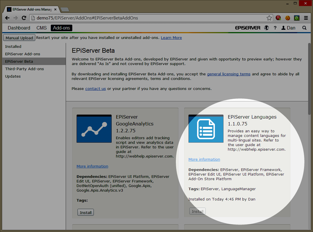 In order to make it easy for you to try it out, this is a step-by-step guide to adding and setting up the Add-On for an EPiServer 7.5 site. Firstly, download the Add-On itself from the Add-On store. At time of writing, the latest version was 1.1.0.75 and it was in the EPiServer Beta section of the Add-On store. Simply click the ‘Install’ button and follow the instructions, remembering to restart your site. (In my screenshot, I’ve already installed it so you’ll see the ‘Install’ button is greyed out.)