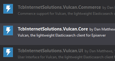 The Core package contains the core of Vulcan and the content indexer. The UI package contains a shell module that adds the UI for managing synonyms. The Commerce package is only required for an Episerver Commerce site – it simply ensures that Vulcan will index the product catalogue as well as the CMS content. The dependencies are set between them so if you install the UI or Commerce package it will pull the Core one down automatically too. Once you’ve installed Vulcan, look in the web.config for the text ‘SET THIS’ and set your Elasticsearch Url and Index name. Optionally, depending on where you are connecting to, you may need to add the VulcanUsername and VulcanPassword app settings keys as well (they aren’t automatically added because you might well be using Elasticsearch locally, for example). Then run your Vulcan Index Content scheduled job (if you go to the UI before you do this, it won’t find any clients.) Now you should be good to search and use the UI. Enjoy!