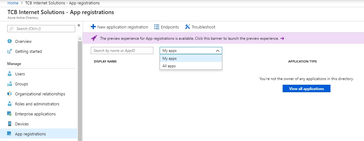 Quick gotcha... if you've left the screens and go back to 'App registrations' you probably won't see the app you created. That's because you need to change the filter from 'my apps' to 'all apps':