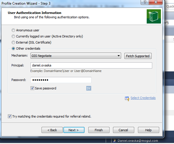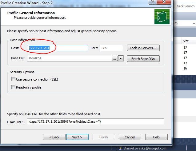 If you can browse in the AD with this tool, you now know that the both the IP and the user detail are correct.