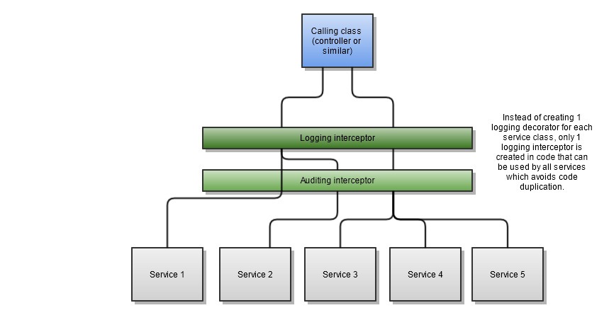 Congratulations! With this single class, you can now enable logging and measure execution time on all classes you want in your solution without touching the actual functionality with a lot of copy / paste code. It's a bit of magic alright so I would personally only use this for logging and auditing. Implementing caching this way would probably leave me sleepless at night or at least with nightmares. This AOP way will probably only be worth the effort for really big projects where you have a lot of service layer classes etc. You will have to weigh the amount of duplicated code vs the increased complexity when choosing to go down this path.
