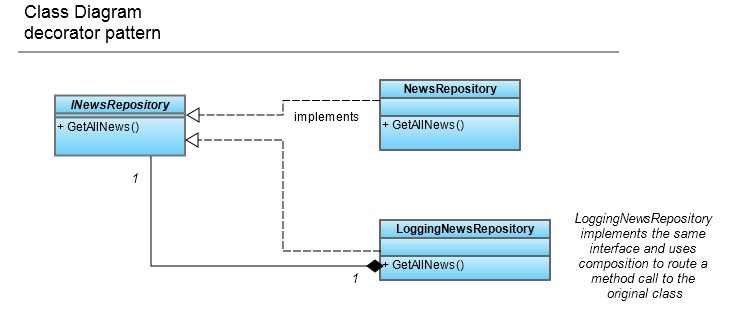 What if we extend the NewsRepository with a decorator pattern instead? This means that we create another class that implements the same interface but routes all calls to the original class (which only contains GetAllNews() functionality and no logging). This new decorator class can then add functionality to the original class without modifying the original class by placing itself "above" it. This is a much more SOLID approach…