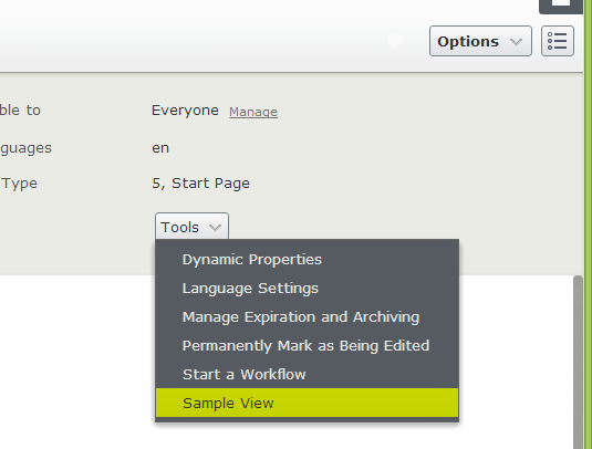 When you have so many view, the drop down many may get crowded. Also, you may want to add your view to some other places, for instance the Tool button under the Content Settings Header, or the Publish/Option menu. This feature has unfortunately missed the train in EPiServer 7.5, but with a little bit effort, we can achieve it.