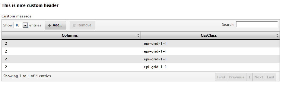 - Also CRUD table can be used as stand alone page, so you can reuse it in some other EPiServer plugins you have. When you don’t want to make your own custom UI for your DDS entities just create URL specifying store name, hidden columns(optional), custom page header and message(optional), for example from url: