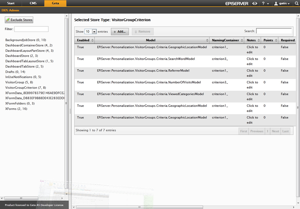 Geta is releasing yet another great open source module for EPiServer. This latest module is create, read, update, delete(CRUD) editor for Dynamic Data Store(DDS). This is how it looks: