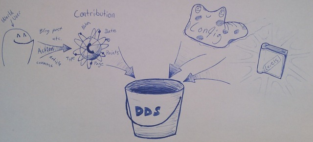 As you can see, all the things you users do on EPiServer World, like post blogs (syndicated blogs also count), write comments, reply to forum threads etc, generates a contribution object that goes into the DDS bucket. The contribution object holds info about date, type (blog post, article, etc), pageid (to link a contribution to a page if relevant), points, user and notes (for internal use).