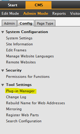 The first thing we do when setting up workflow for our environment is to disable the workflow tab provided by EPiServer. We do this by going to Admin Mode, selecting the “Config” tab, and then selecting “Plug-in Manager”