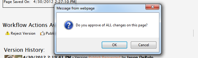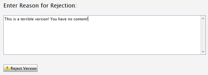 If the “Reject” button is pressed, the user is prompted to explain why the version is not satisfactory, the page is rejected (using the methodology explained in Post #4) and the user is notified that they have some changes that need to happen for the post goes live.