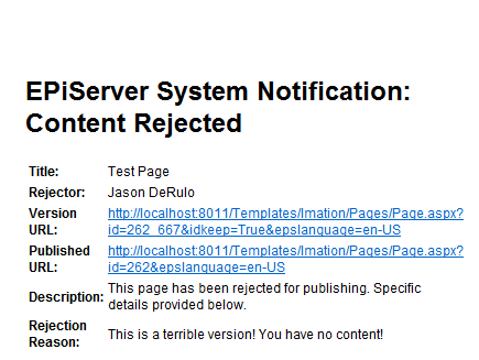 This is the email that is then triggered to the original content submitter, providing them with some information about the reason behind their content being rejected.