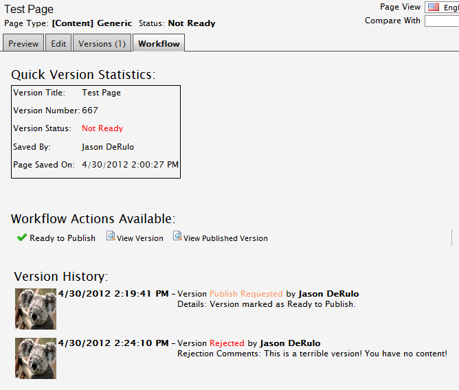 As you’ll note, the above page has all of our actions available (since the status is “Ready to Publish”) – the user can publish the version directly, view this version in a browser, compare it with the published version, or reject the page – the latter being the one thing that EPiServer does not support out of the box.