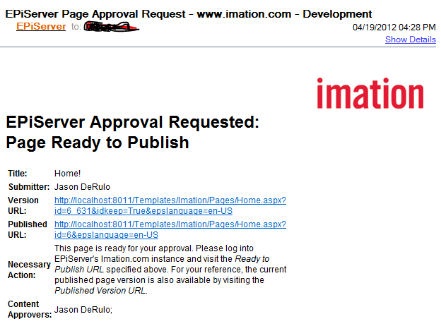 When “Ready to Publish” is pressed, an email is sent to all of the approvers in the system for that particular piece of content notifying them that the page is ready to be published and they can look at it (we’ll go into hooking the Ready To Publish action in Post #6).