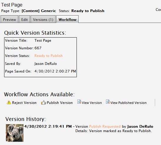 Generally, a user should click the “Version URL” link and go right to the page – where they can then select the “Workflow” tab to perform actions on the page itself: