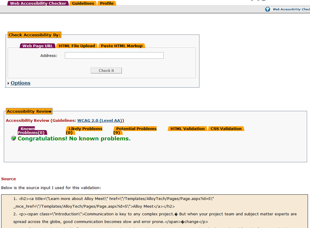 Fortunately if you are not ready to do the local install, AChecker also provides a URL that can take HTML as input through POST request, and return the errors and warnings to you. Better still, it has a ready to use TinyMCE plug-in that you can take and plug straight into your EPiServer editor. This probably is exactly what editors need as they only need to care about the content they are responsible for instead of the entire page.