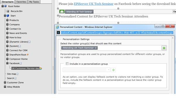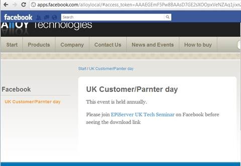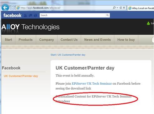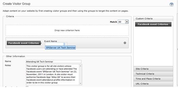 On the #epidayuk event I demonstrated how to create a custom visitor group criterion with a custom Dojo widget and a MVC controller. Since the entire day had a social theme I could not miss the chance to get into Facebook development. On the day, the code was explained to the tech session attendees and download can be enabled by joining a Facebook event. It is totally understandable that some may not want to expose their Facebook credentials, let alone to authorise some Facebook app that was created by a guy they only met once. So as promised in the seminar, and for the general public who may think this is useful, a Facebook Event Attendance Criterion.