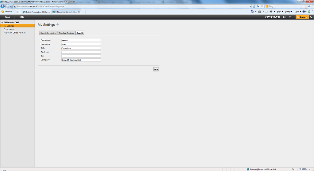 I’m sure many of you has written plugins to let editors/admins edit additional fields in the user profiles. This was a feature in CMS 4 but was removed in CMS 5. Many of my customers (and myself) wondered why since this feature was widely used and it’s so easy to implement. Anyhow… I’ve gotten tired of doing the same thing in every site that I build so I decided to do a plugin that I just drop in the bin folder.I’ve written a configurable plugin that plugs in in the SidSettingsArea, i.e you get an extra tab in your “Edit user” or “My settings” page. This tab gives you the ability to edit fields in the profile that otherwise wouldn’t be visible.
