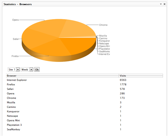 Beneath you can see a demontration of the Browser report displaying how many users use the different kind of web browsers. As you can see on the screenshot you can select data from different sites using the dropdown. The site dropdown is automagicaly populated based on the logon account for the gadget on Google Analytics. This means its not limited to the episerver site itself. The current relase of this gadget only support a basic time drill down: Today, this week, this month and this Year. Maybe a post a updated version of this gadget in the near future…