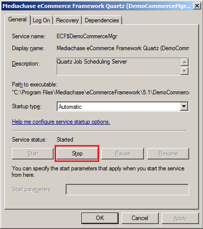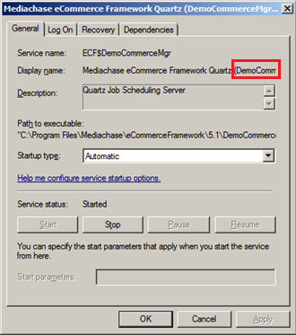 5. Copy the “Service name” from this window. In the screen shot above it is “ECF$DemoCommerceMgr”.