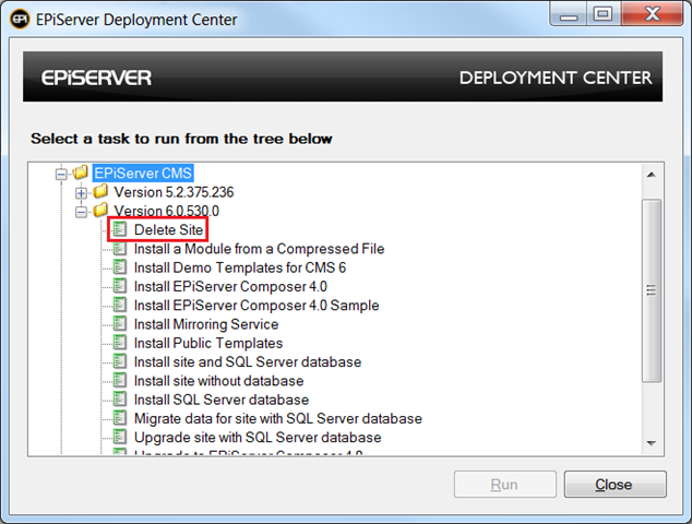 The first thing to note is that there are two sites to be removed. One is the CMS site, which if you used the EPiServer Commerce Sample Package is represented by the “Click + Talk” store site. The other is the Commerce Manager site. Removing the first site is easy, as you can use Deployment Center to follow the same removal steps you’d use for any CMS site, by using the “Delete Site” option. A sample screen shot is below, however, I will skip the details on removing a standard CMS site since you are likely already familiar with this process and I will move on to the Commerce Manager removal instructions.