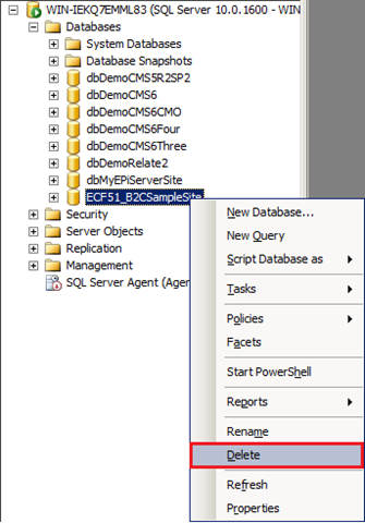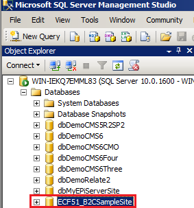 2. Locate the Commerce Manager site in the SQL Server Management Studio under the “Databases” node. If you accepted the defaults, it may be “ECF51_B2CSampleSite”.