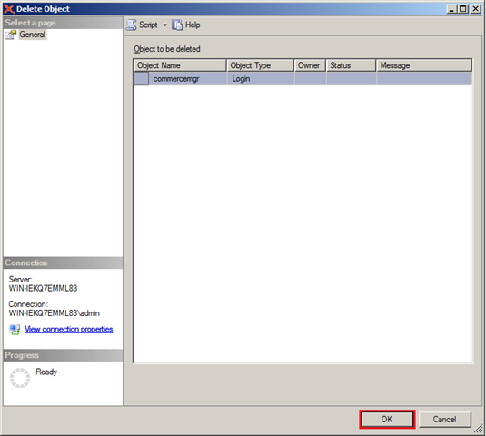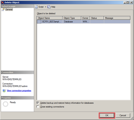 4. Select the “OK” button on the “Delete Object” window to remove the database.