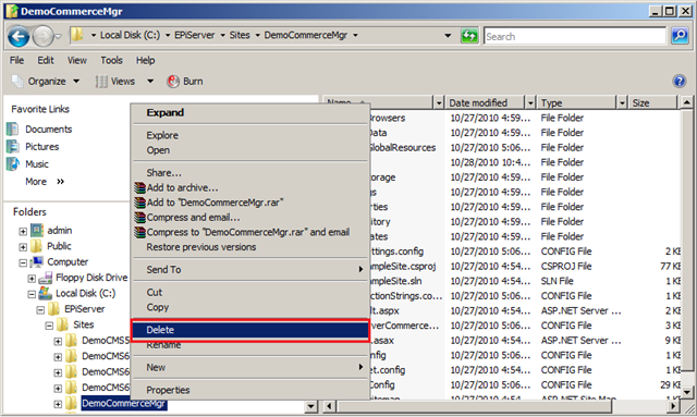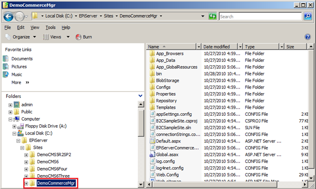 1. Navigate to the Commerce Manager site site on the local file system in Windows Explorer. Typically this is C:\EPiServer\Sites\<site name> (e.g. C:\EPiServer\Sites\DemoCommerceManager\).