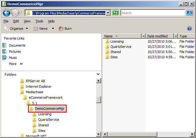 1. Navigate to the Commerce framework files on the local file system for the site in Windows Explorer. Typically this is at C:\Program Files\Mediachase\eCommerceFramework\5.1\<site name> (e.g. C:\Program Files\Mediachase\eCommerceFramework\5.1\DemoCommerceMgr).