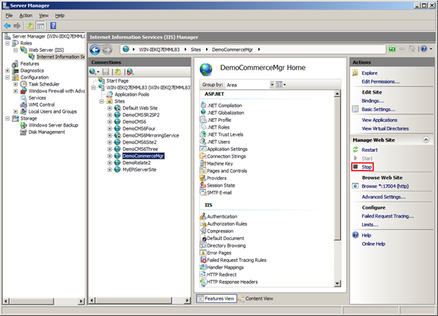 1. First, to make sure the running site doesn’t get in the way, open IIS, navigate to the Commerce Manager site, and select the “Stop” button.