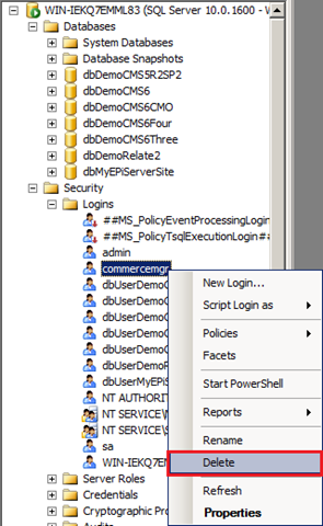 4. Right click on this user name and select “Delete”. The default is “ecfuser” but I named mine “commeremgr” and the following screen shot reflects this.