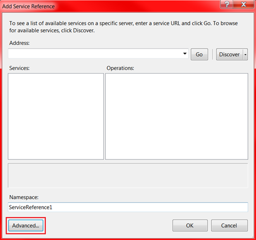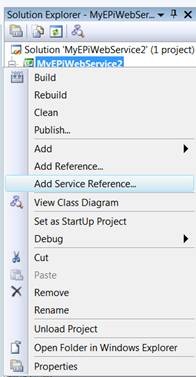 2) Right click the newly created project name in VS Solution Explorer and select “Add Service Reference…”