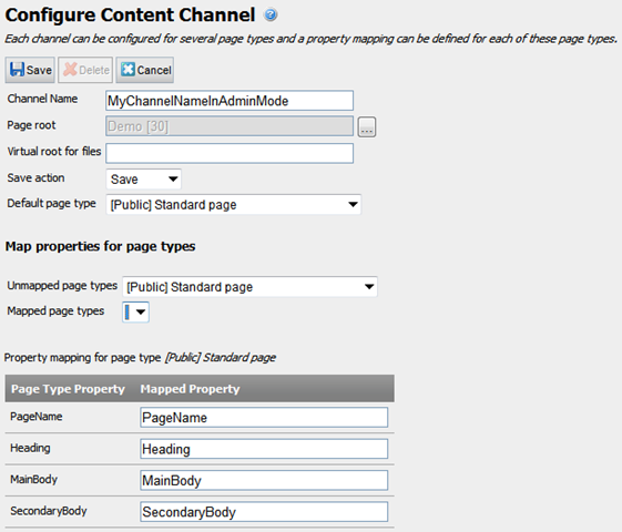 3) Assign a “Channel Name” and configure the Content Channel. Please see the Admin Guide for more information on configuring Content Channels. The screen shot below is from Admin mode for Content Channels. The “Mapped Property” names you specify for these will represent your “key names” in that you will use in code later. You will want to look at your legacy data store to determine which data items you will be retrieving in order to get ideas on names for the Mapped Properties.