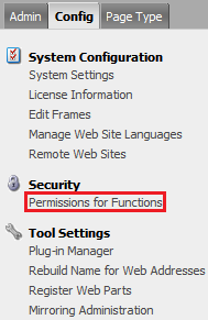 5) In the CMS navigate to the Admin tab and select “Permissions for Functions” from the “Config” menu.