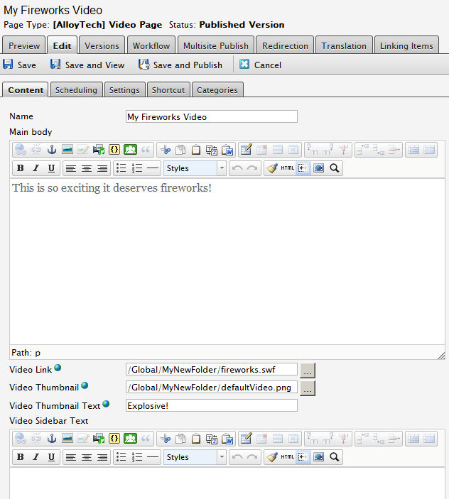 - Video Page Template – the template code for the Page Type